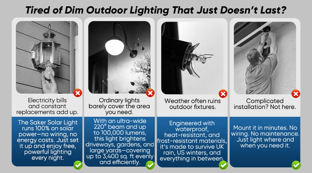 Thanks to its 220° wide-angle design, it can illuminate up to 3,400 sq. ft (396㎡) – perfect for large driveways, gardens, or security areas. It lights up more space than traditional wall lights or spotlights.
